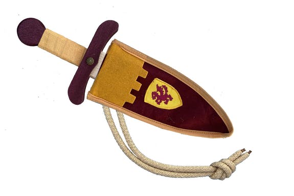 Dague en bois de hêtre très résistant. Manche recouvert de couleur suède très agréable au toucher. Couverture en feutre avec corde à nouer autour de la taille. Bouclier avec dragon brodé sur le fourreau.