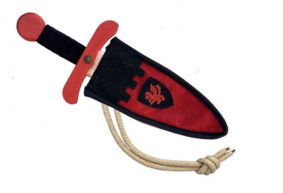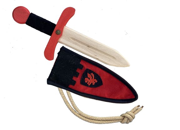 Dague en bois de hêtre très résistant. Manche recouvert de couleur suède très agréable au toucher. Couverture en feutre avec corde à nouer autour de la taille. Bouclier avec dragon brodé sur le fourreau.